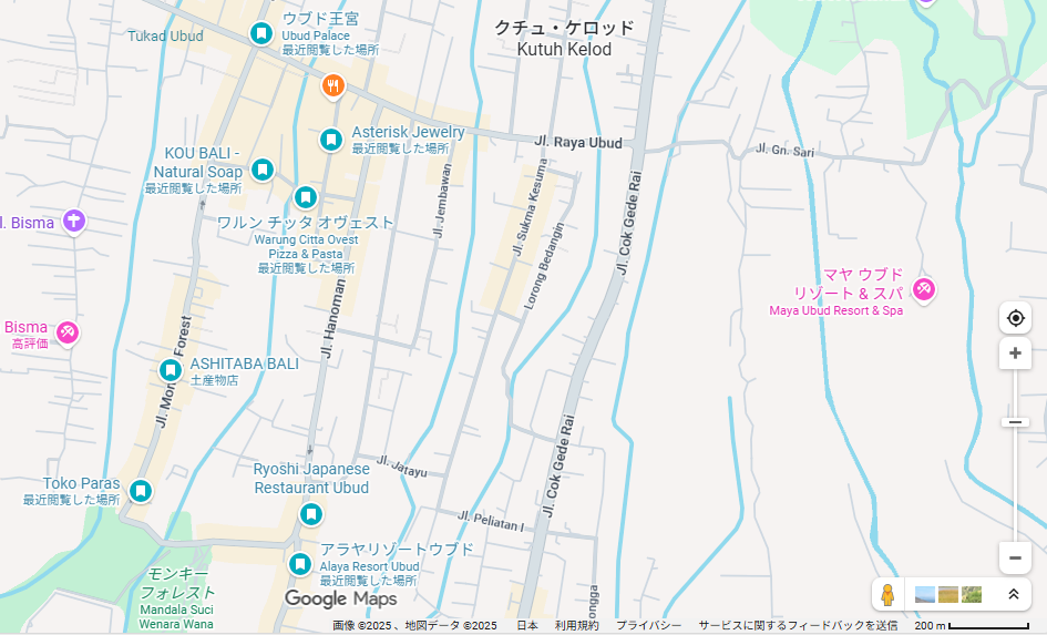 地図一番下が泊まったホテル、その西側にあるのがモンキーフォレスト(Googleマップ)、一番上がウブド王宮(Googleマップ)、ホテルすぐ上の「Ryoshi」(Googleマップ)は夕食でお世話になったレストラン、それ以外の青いマークはウブド観光でチェックしていた場所です。